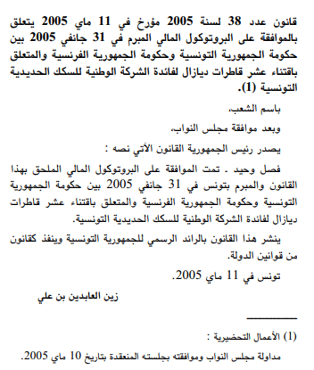 واُبرمت هذه الصّفقة في إطار "بروتوكول ماليّ" بين الحكومتين التونسيّة والفرنسيّة بتاريخ 31 يناير 2005، والذّي صادقت عليه الرئاسة التونسيّة في 11 مايو 2005، وفق القانون رقم 38 لسنة 2008 المنشور في العدد 38 للرّائد الرّسمي لسنة 2005.