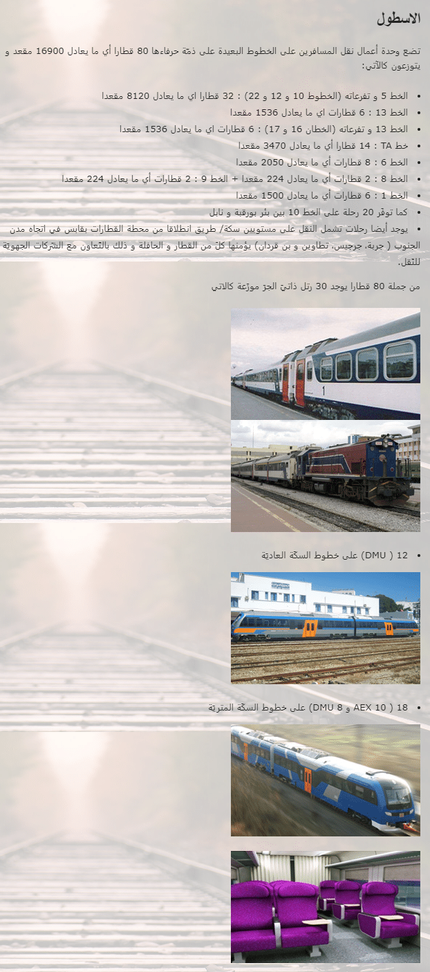 السّكك الحديديّة: أسطول الشّركة يتكوّن من 80 قطارًا بينهم 30 عربة ذاتيّة للجرّ.