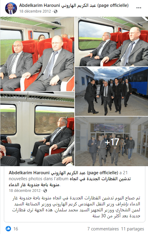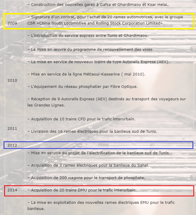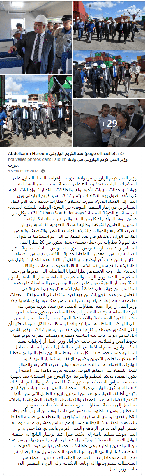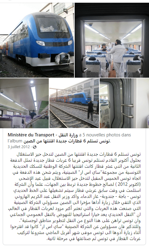 وأشار الموقع إلى أنّه تمّ إتمام الصّفقة فعليّا يوم 17 ديسمبر 2012، وهو تاريخ تدشين القطارات تحت إشراف وزراء النّقل والصّناعة والتجهيز، وفق منشور على صفحة عبد الكريم الهاروني على فيسبوك بتاريخ 18 ديسمبر 2012.