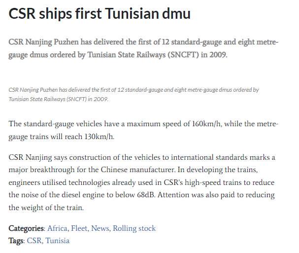 وكشف تقرير للمجلّة الدوليّة للسّكك الحديديّة (International Railway Journal) أنّ المجموعة الصينيّة قامت، في فبراير 2012، بشحن أول قطار إلى تونس، من أصل 12 قطارًا يسيرُ على السّكك العاديّة بسرعة 160 كم في السّاعة، بالإضافة إلى 8 أخرى تسيرُ على السّكك المتريّة بسرعة 130 كم في السّاعة، كانت قد طلبتها شركة السّكك الحديدية، وهو ما يتوافقُ مع تصريحات كل من المدير العام للشّركة ووزير النّقل.