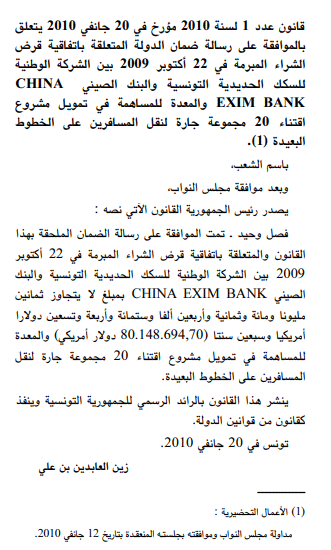 ويُبيّن التقرير أنّه تمّ في خطوة موالية، عرض الاتفاقيّة على مجلس النّواب التونسيّ للمداولة بشأنها، وقد تمّ المصادقة على القرض والموافقة على إصدار ضمان سياديّ من الحكومة لدعمه في 12 يناير 2012. ثمّ تمّت إحالة كلّ من القرض والضّمان على زين العابدين بن عليّ، رئيس الجمهوريّة آنذاك، للمصادقة عليهما في 20 يناير 2012، ونُشر في الرّائد الرّسمي رقم 7 لسنة 2010.
