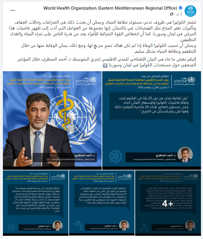 [gallery jnewsslider_title="تداول صفحات "فيسبوك" و"تويتر"" size="full" ids="13351,13352,13349,13350,13353,13361,13362,13363,13359,13360"]وانتشر وباء الكوليرا في دول مجاورة لمصر، حيث تعاني 8 دول من بين 22 دولةً في إقليم شرق المتوسط و29 دولةً على مستوى العالم منها، وهو أعلى رقم مُسجّل في التاريخ، وفقًا لتصريحات الدكتور أحمد المنظري المدير الإقليمي لمنظمة الصحة العالمية لشرق المتوسط.