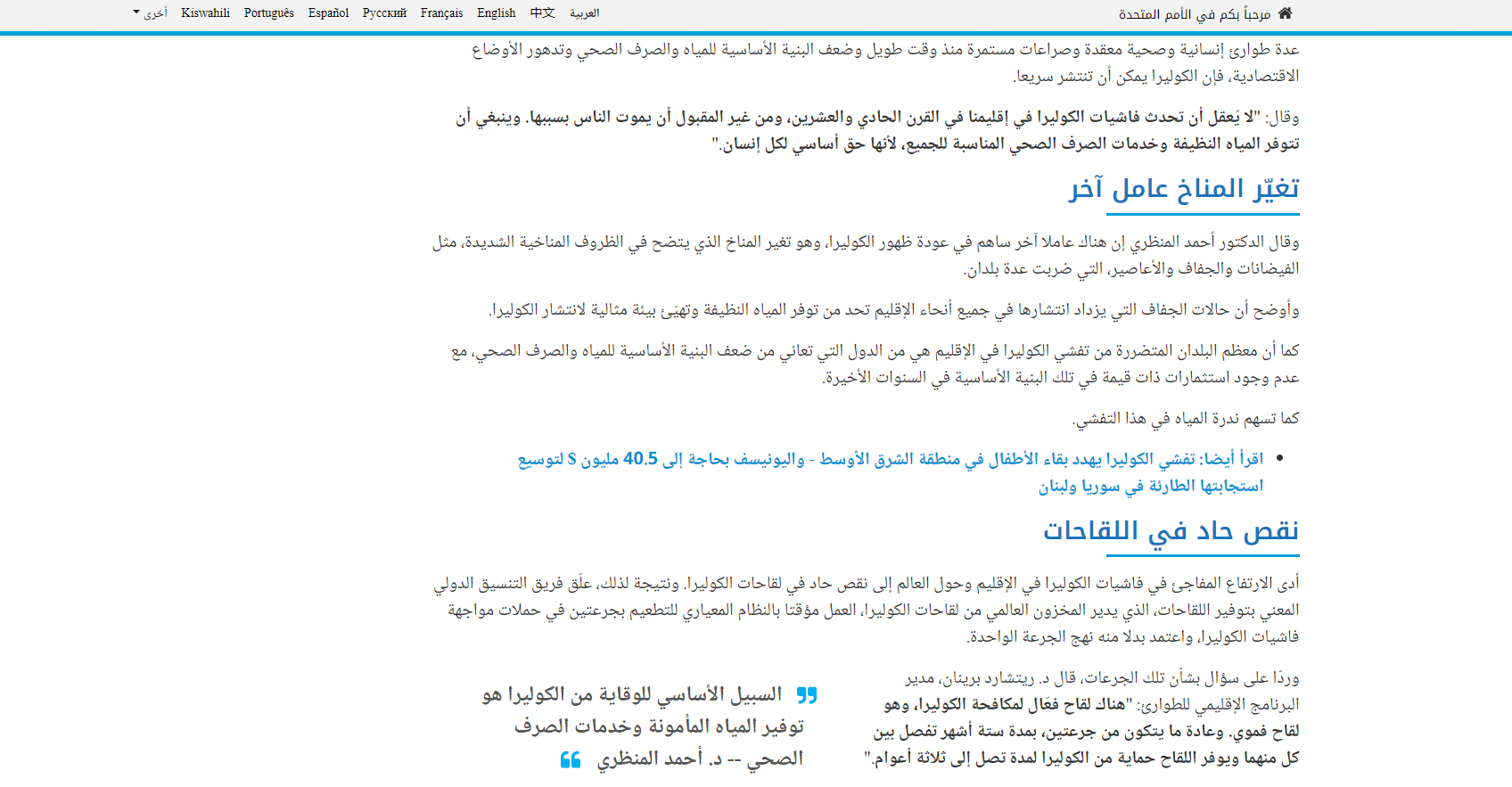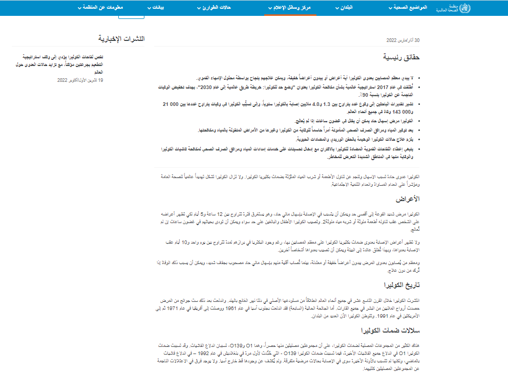 وأكد الدكتور أحمد المنظري، المدير الإقليمي لمنظمة الصحة العالمية لشرق المتوسط، أن معظم البلدان المتضررة من تفشي الكوليرا في الإقليم هي من الدول التي تعاني من ضعف البنية الأساسية للمياه والصرف الصحي، مع عدم وجود استثمارات ذات قيمة بالبنية الأساسية في السنوات الأخيرة، مشيرًا إلى أن الارتفاع المفاجئ في تفشي الكوليرا في الإقليم وحول العالم أدى إلى نقص حاد في اللقاحات.