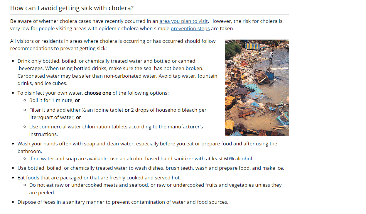 أكد مركز السيطرة على الأمراض والوقاية منها أنه على جميع الزوار أو المقيمين في المناطق التي ينتشر فيها الكوليرا، اتباع التوصيات لمنع الإصابة بالمرض، ومنها تناول المياه الآمنة مثل المياه المعبأة أو المغلية أو المعالجة كيميائيًا أو المشروبات المعبأة أو المعلبة، مع تجنب مياه الصنبور، ومكعبات الثلج، والشرب من النافورة.