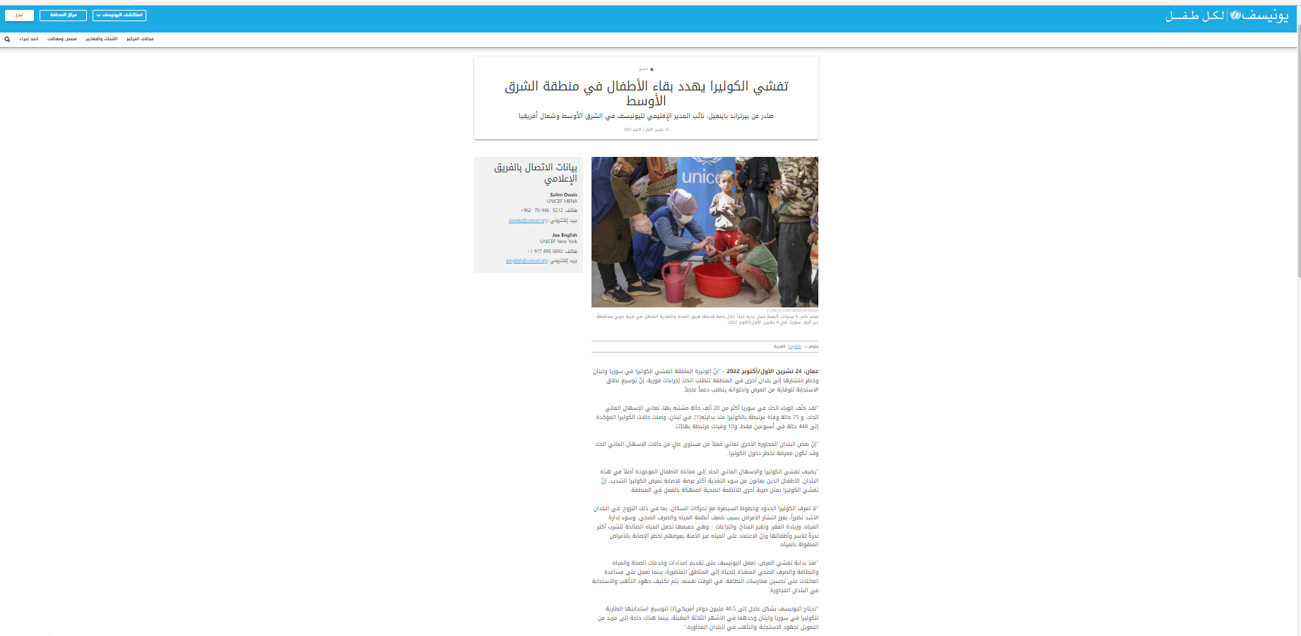 وكانت منظمة الأمم المتحدة للطفولة "اليونيسيف"، أكدت يوم 24 أكتوبر 2022 أن الوتيرة المُقلقة لتفشي الكوليرا في سوريا ولبنان وخطر انتشارها إلى بلدان أخرى في المنطقة، تتطلب اتخاذ إجراءات فورية، مشيرة إلى أن توسيع نطاق الاستجابة للوقاية من المرض واحتوائه يتطلب دعمًا عاجلاً.
