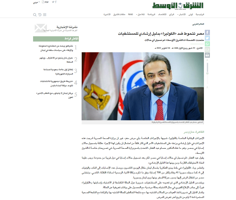 وفى إطار ذلك نشر موقع "المصري اليوم" في 23 أكتوبر 2022، أن وزارة الصحة والسكان عممت دليلًا استرشاديًا على مستشفياتها وقطاعاتها المختلفة للتعامل مع الحالات المصابة بالكوليرا حال اكتشافها، كخطوة وقائية بعد اكتشاف حالات في بلدان مجاورة خلال الفترة القليلة الماضية، بالإضافة إلى تحذيرات منظمة الصحة العالمية من تفشيها.