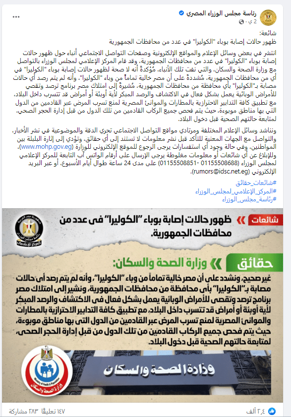 أكدت وزارة الصحة والسكان المصرية أنه لا صحة لظهور حالات إصابة بوباء "الكوليرا" في أي من محافظات الجمهورية، مُشددةً على أن مصر خالية تمامًا منها، وأنه لم يتم رصد أي حالات مصابة، وذلك خِلال بيانٍ نُشر بالصفحة الرسمية لرئاسة مجلس الوزراء عبر موقع التواصل الاجتماعي "فيسبوك"، يوم 3 نوفمبر 2022.