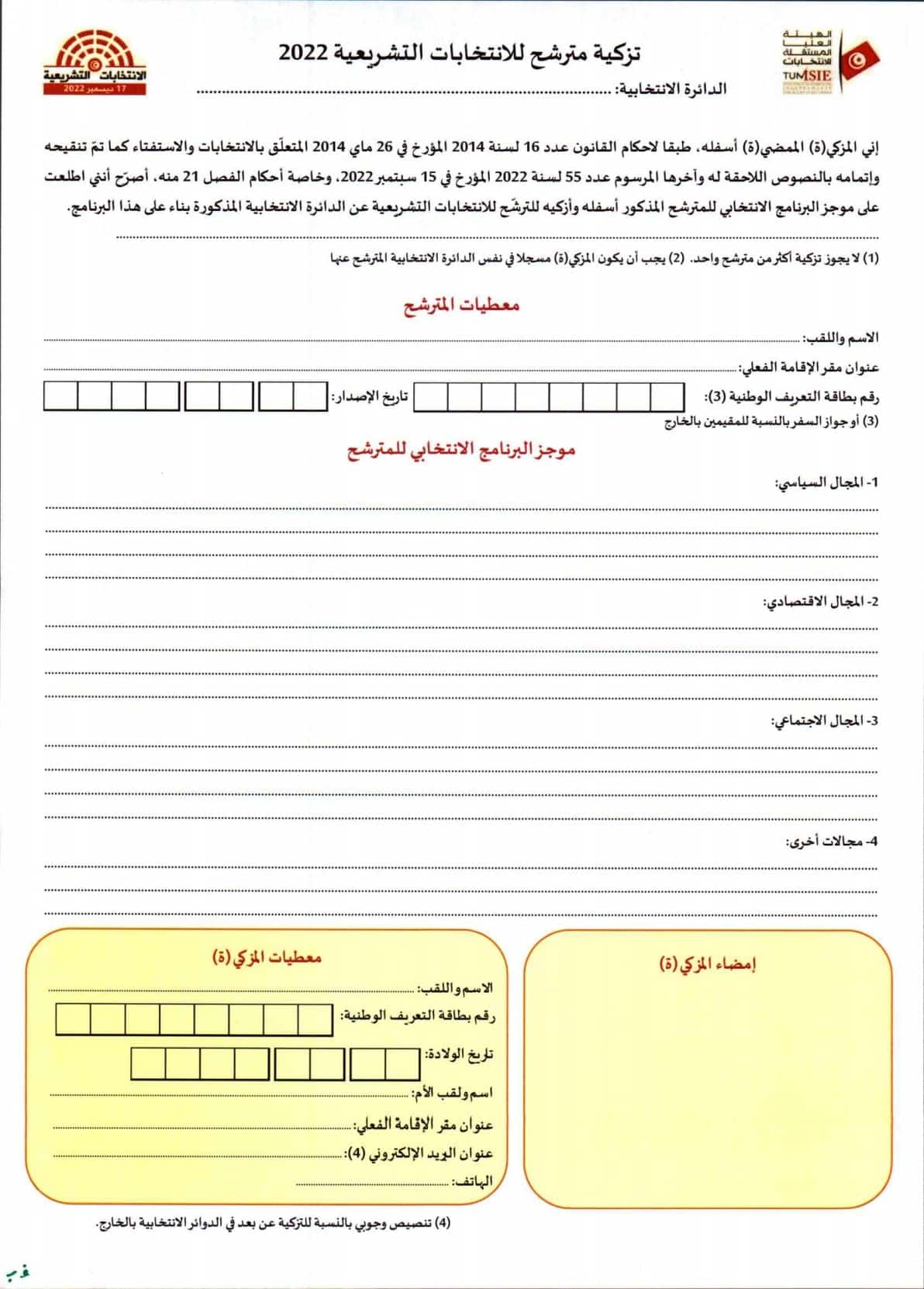 استمارة تزكية مترشّح للانتخابات التشريعيّة 2022