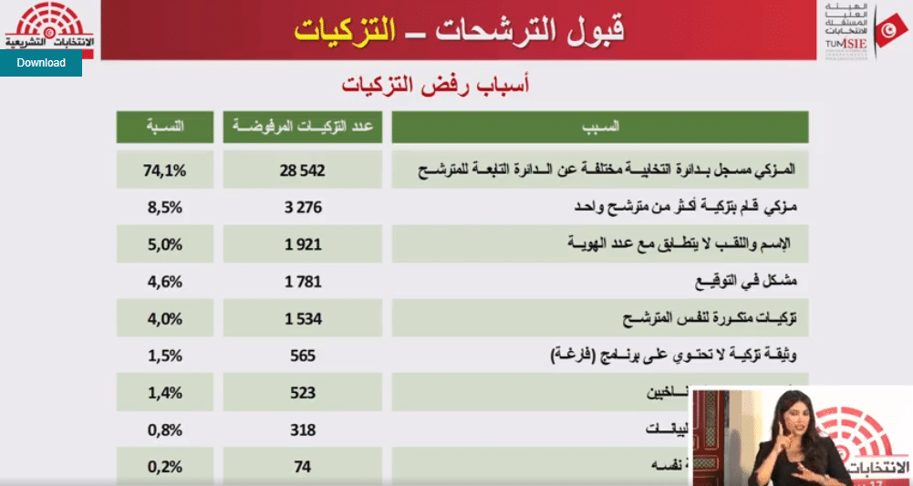 وأفاد فاروق بوعسكر أنّهُ تمّ رفض 281 مطلبًا للترشّح للانتخابات التشريعيّة لوجود خلل في التزكيات، وذلك بنسبة 77% من إجمالي المطالب المرفوضة.