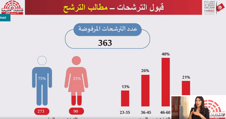 كما رفضت الهيئة العليا المستقلّة للانتخابات مبدئيّا 363 مطلبًا للترشّح للانتخابات التشريعيّة المرتقب إجرائها في 17 ديسمبر 2022، من إجماليّ 1427 ترشّحًا مقدّمًا.