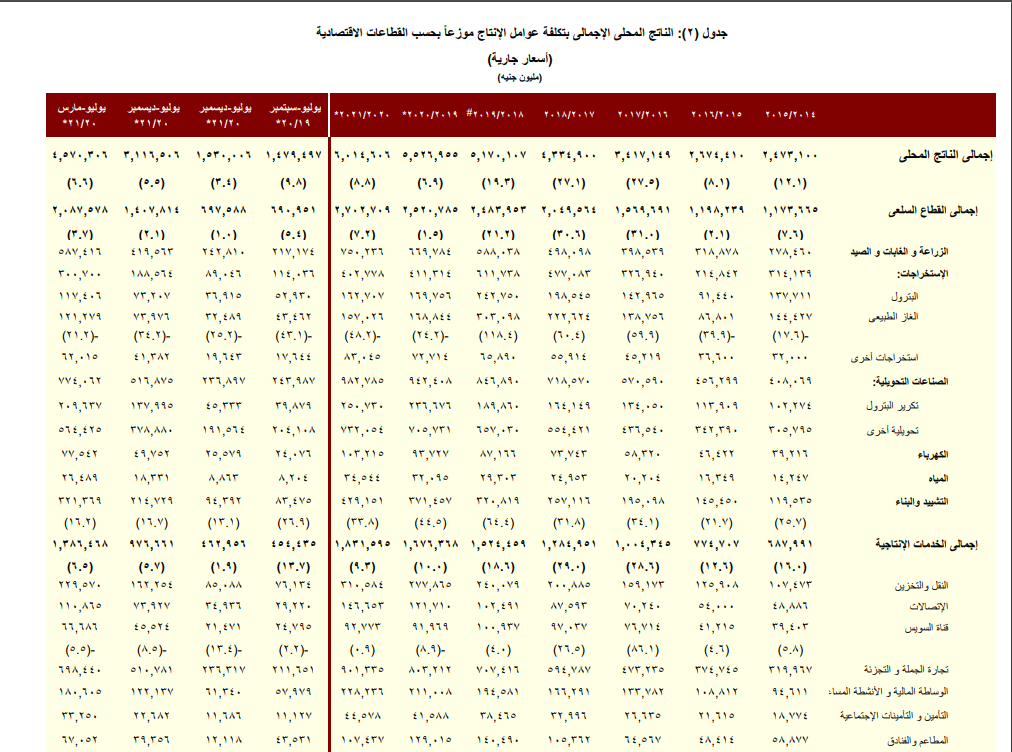 وبالرجوع إلى الأعوام السابقة فقد ساهم القطاع بـ669.8 مليار جنيهًا بنسبة 12.1% من إجمالي الناتج المحلي في عام 2019 ـ 2020، مقابل نحو 588 مليار جنيهًا بنسبة 11.3% من إجمالي الناتج المحلي في عام 2018 ـ 2019، فيما سجل 498.1 مليار جنيهًا بنسبة 11.4% من إجمالي الناتج المحلي في عام 2017 ـ 2018.