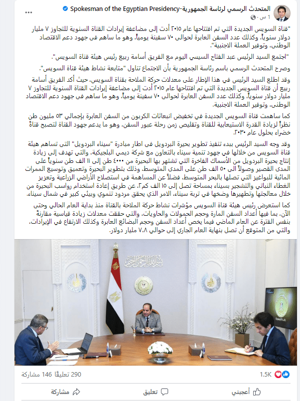 مجلس الوزراء: سجلت إيرادات قناة السويس 5 مليارات دولار عام 2016 ـ 2017، وأسامة ربيع: القناة تحقق أعلى إيراد سنوي في تاريخها 7 مليار دولار لعام 2021 ـ 2022