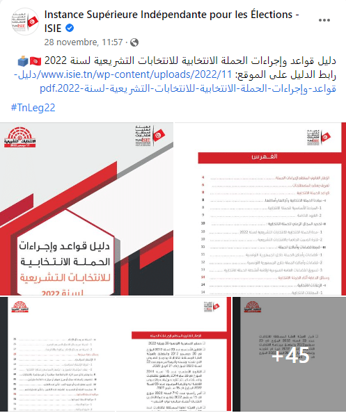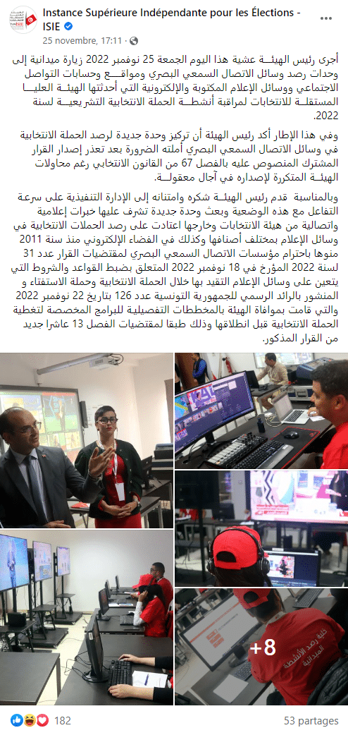 أعلنت الهيئة، في وقت سابق، إنشاء 3 وحدات رصد وسائل الاتصال السمعي البصريّ ومواقع وحسابات التواصل الاجتماعي ووسائل الإعلام المكتوبة والإلكترونيّة لمراقبة أنشطة الحملة الانتخابيّة التشريعيّة لسنة 2022، وذلك وفق ما نقله منشور على صفحتها الرسميّة على فيسبوك يوم 25 نوفمبر 2022.