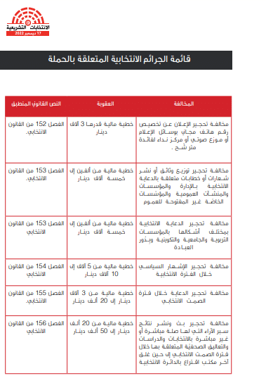 وتفرضُ الهيئة العليا المستقلّة للانتخابات غرامات ماليّة من 2000 إلى 50 ألف دينارًا، وعقوبات بالسجن وشطب الترشّح وإلغاء الأصوات والعضويّة على المترشّحين المخالفين لقواعد وإجراءات تنظيم الحملة، التّي نصّت عليها في الدّليل استنادًا لأحكام القانون الانتخابي.