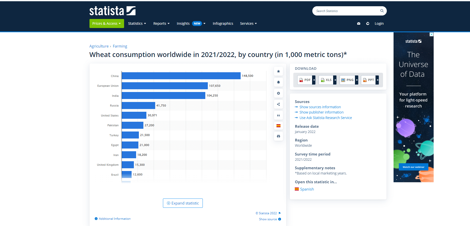 [gallery jnewsslider_title="بيانات وزارة التعاون الدولي المصرية" size="full" columns="2" ids="13964,13965"]وأوضحت بيانات موقع ستاتيستا المتخصص في بيانات السوق والمستهلكين أن مصر تأتي في المركز الثامن بين مستهلكي القمح في العالم في عام 2021 ـ 2022، بحجم استهلاك 21 مليون طنًا.