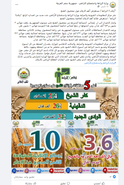 وأكدت بيانات وزارة التعاون الدولي المصري، أن إنتاج مصر من القمح يبلغ من 8 إلى 9 ملايين طن سنويًا، وهو ما نشرته الوزارة في الصفحة الرسمية لرئاسة مجلس الوزراء على موقع التواصل الاجتماعي "فيسبوك" في يومي 11 مايو و27 ديسمبر 2021.