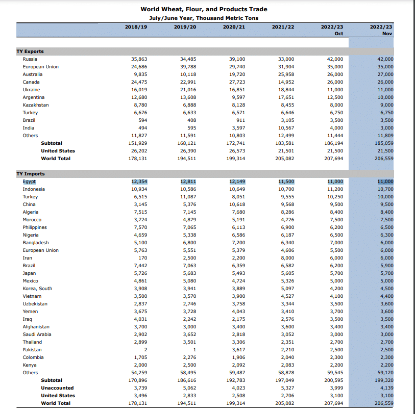 [gallery columns="2" size="full" jnewsslider_title="بيانات وزارة التعاون الدولي المصرية " ids="13964,13965"]وذكرت وزارة الزراعة الأمريكية عبر تقرير لها في نوفمبر 2022، أن مصر تستورد من 11 إلى 12 مليون طنًا من القمح سنويًا.