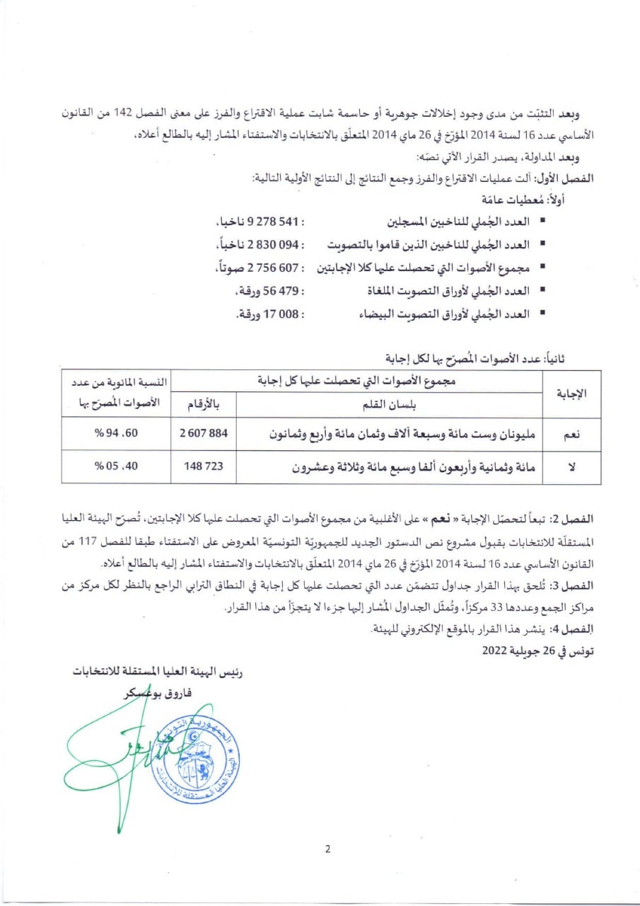 هيئة الانتخابات: 148 ألف تونسيًا صوتوا بـ"لا" في الاستفتاء على الدستور بنسبة 5.4% من المصوتين
