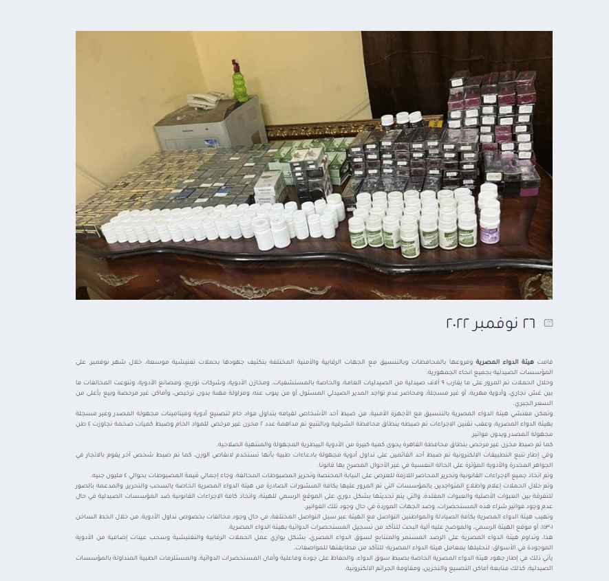 هيئة الدواء المصري تنشر 33 نشرةً دوريةً لغش تجاري وسحب دواء خلال 2022.