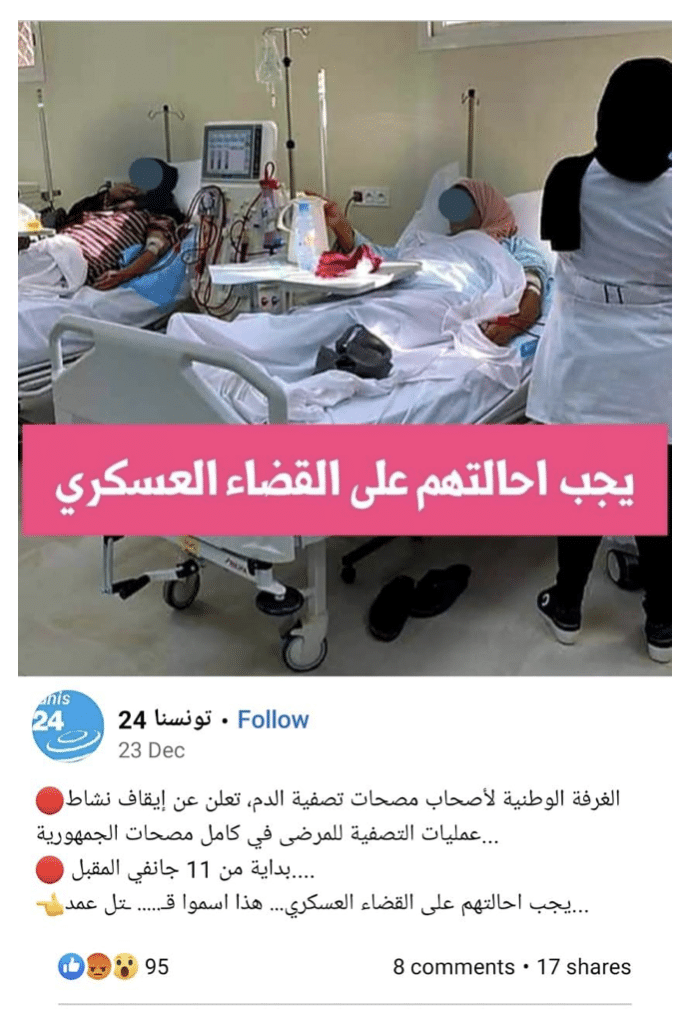 تداولت العديد من منصات التواصل الاجتماعي خبراً مفاده "توقّف عمليات تصفية الدم (غسيل الكلي)، في المصحات الخاصة بتونس بداية من 11 يناير 2023"، وذلك خلال اليومين الماضيين