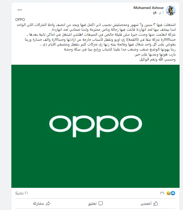 وبتطوير البحث توصل فريق عملنا لعدد كبير من موظفي شركة Oppo أعلنوا عبر موقع التواصل الاجتماعي "فيسبوك"، استغناء الشركة عنهم بعد سنوات من العمل فيها، مؤكدين أن الأسباب هي وقف الاستيراد وسعر الدولار، وأن الشركة تصرف مرتبات آلاف الموظفين منذ فبراير 2022 بدون مبيعات.