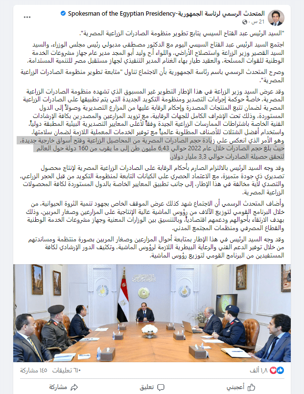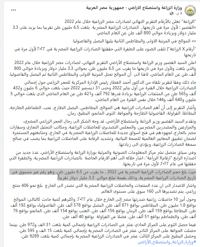 وفي 7 يناير 2023، أعلنت وزارة الزراعة المصرية، أن حجم الصادرات الزراعية في 2022 ، بلغ ما يقرب من 6.5 ملايين طن، وهو رقم غير مسبوق في تاريخ الصادرات الزراعية المصرية، وذلك بقيمة تبلغ حوالي 3.3 مليارات دولار، وذلك خِلال بيانٍ نُشر بالصفحة الرسمية للوزارة.