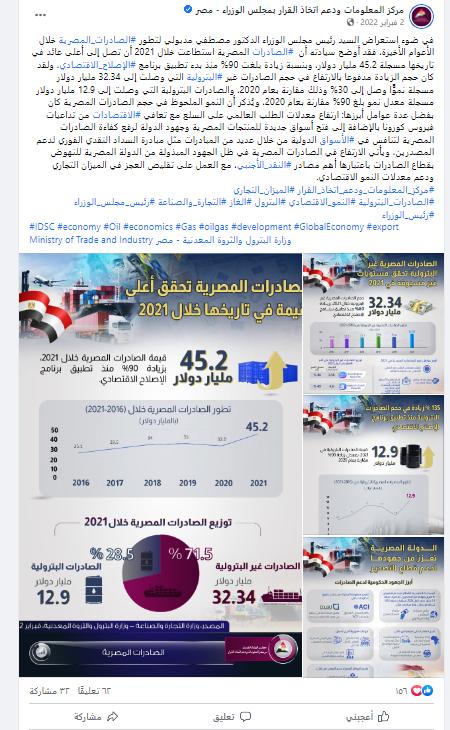 في 2 فبراير 2022، كشف مركز المعلومات واتخاذ القرار التابع لمجلس الوزراء المصري، ارتفاع الصادرات البترولية إلى 12.9 مليار دولارًا في عام 2021، مقارنةً بـ7.2 مليارات دولار في عام 2020، وذلك عبر صفحتها الرسمية على موقع التواصل الاجتماعي "فيسبوك".
