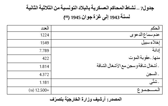 وينقل الباحث التّونسي خميّس العرفاوي في كتابه "القضاء والسياسة في تونس زمن الاستعمار الفرنسي 1881 - 1956"، أنّ القوّات العسكريّة الفرنسيّة باشرت النّظر في التعدّيات التي يرتكبها تونسيّون ضد الفرنسيّين أو القوّات الفرنسيّة مع بداية "عهد الحماية" عبر مجالسها الحربيّة، وبصفة عامّة فإنّها كانت تلجأ إلى القضاء العسكري لمحاكمة المدنيّين التّونسيّين في ظروف التوتّر والحصار وعندما تعجز مؤسسات الرّدع المدنيّة عن فرض "السّلم". ويرصدُ "تفنيد" بالاستناد إلى ذات المصدر جدولة بيانيّة لنشاط المحاكم العسكرية الفرنسيّة بتونس بين يونيو 1943 ويونيو 1945، أي حصيلة سنتين فقط من الاستعمار الفرنسي لتونس الذّي استمرّ طوال 76 عامًا: