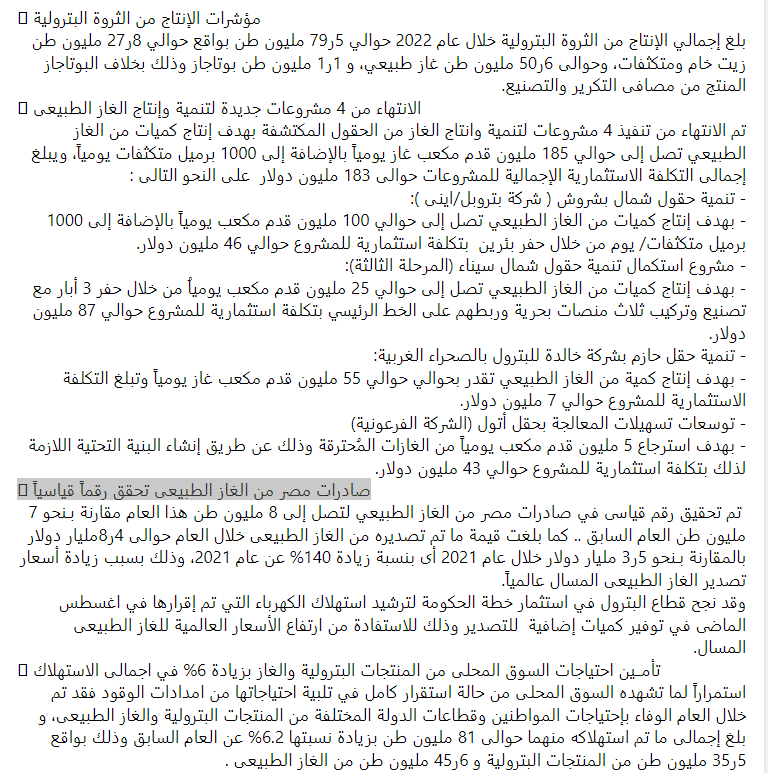 كشف تقرير حصاد وزارة البترول أنه تم الانتهاء من تنفيذ 4 مشروعات لتنمية وإنتاج الغاز من الحقول المكتشفة بهدف إنتاج كميات من الغاز الطبيعي تصل إلى حوالي 185 مليون قدمًا مكعبًا من الغاز يوميًا، بالإضافة إلى 1000 برميل متكثفات يوميًا، ويبلغ إجمالي التكلفة الاستثمارية الإجمالية للمشروعات حوالي 183 مليون دولارًا. وأوضح التقرير، تنمية حقل حازم بشركة خالدة للبترول بالصحراء الغربية، بهدف إنتاج كمية من الغاز الطبيعي تقدر بحوالي 55 مليون قدمًا مكعبًا من الغاز يوميًا، وتبلغ التكلفة الاستثمارية للمشروع حوالي 7 ملايين دولار.بالرجوع لبيانات وزارة البترول اكتشفنا "عدم دقة" تصريحات وكيل مجلس النواب المصري إذ بلغت صادرات الغاز الطبيعي 8.4 مليارات دولار فقط في 2022 ولم تصل لـ14 مليار دولارًا