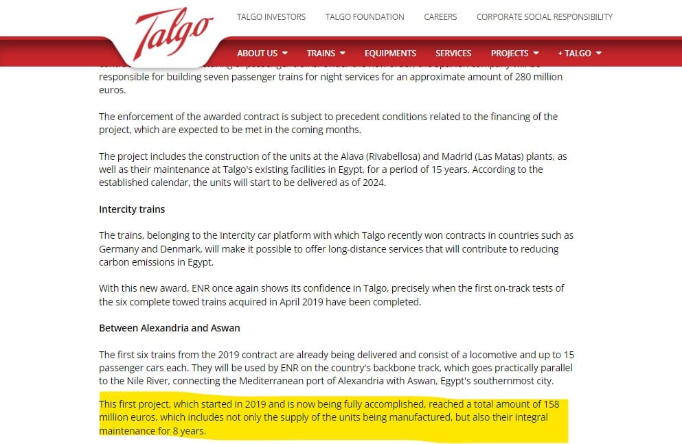 وهو ما أكدته بيانات الشركة، إذ أعلنت تسليم 6 قطارات إلى مصر من عقد 2019، وتتألف من قاطرة وما يصل إلى 15 سيارة ركاب لكل منها، بتكلفة إجمالية قدرها 158 مليون يورو (حوالي 171 مليون دولار)، وتشمل التكلفة توريد الوحدات التي يتم تصنيعها إضافة إلى صيانتها المتكاملة لمدة 8 سنوات.