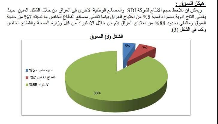 وفي تقرير أصدرته شركة أدوية سامراء التابعة لوزارة الصناعة العراقية، حول خطتها لعام 2021، ذكرت الشركة أن إنتاج أدوية سامراء يغطي نسبة 5% من احتياج العراق بينما تغطي مصانع القطاع الخاص ما نسبته 7% من حاجة السوق، وما تبقى في حدود 88% من احتياج العراق يتم من خلال الاستيراد من قبل وزارة الصحة والقطاع الخاص.