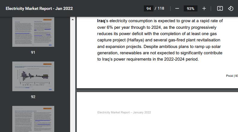 وتقول وكالة الطاقة الدولية في تقرير في يناير 2022، إنه من المتوقع أن ينمو استهلاك الكهرباء في العراق بمعدل سريع بأكثر من 6% سنويًا حتى عام 2024.