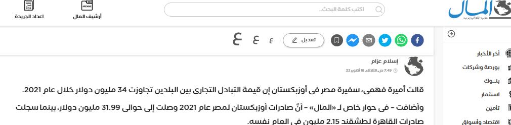 وأوضحت أميرة فهمي، سفيرة مصر في أوزباكستان، في حوار خاص لموقع المال، إن قيمة التبادل التجاري بين البلدين تجاوزت 34 مليون دولار خلال عام 2021.
