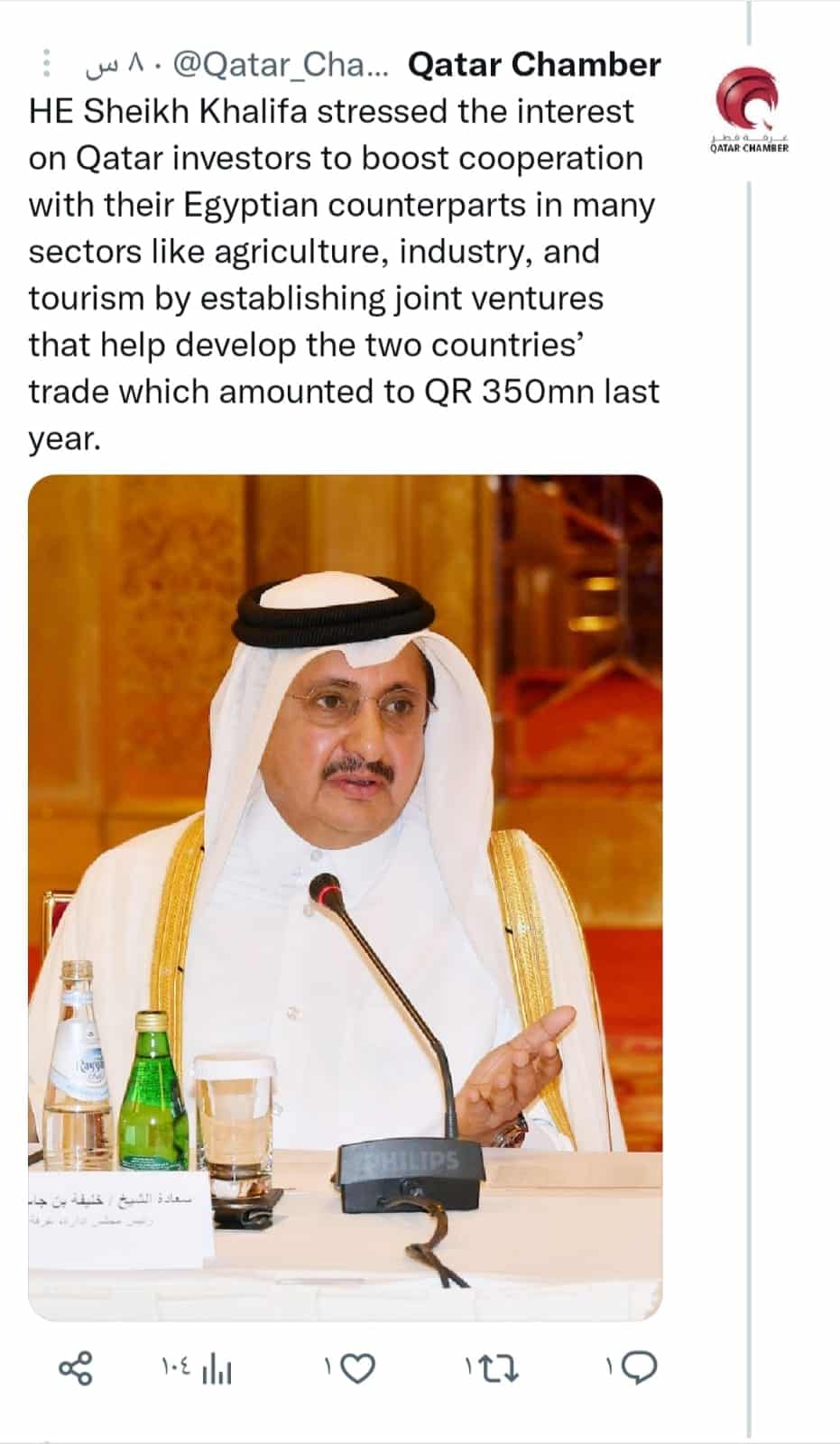 ذات الرقم سبق أن نشرته غرفة التجارة القطرية على حسابها بموقع التواصل الاجتماعي "تويتر"، إذ أكد الشيخ خليفة بن جاسم، اهتمام المستثمرين القطريين بتعزيز التعاون مع نظرائهم المصريين في العديد من القطاعات مثل الزراعة والصناعة والسياحة من خلال إقامة مشاريع مشتركة تساعد على تنمية التجارة بين البلدين، والتي بلغت 350 مليون ريال قطري (96.15 مليون دولار ) العام الماضي.