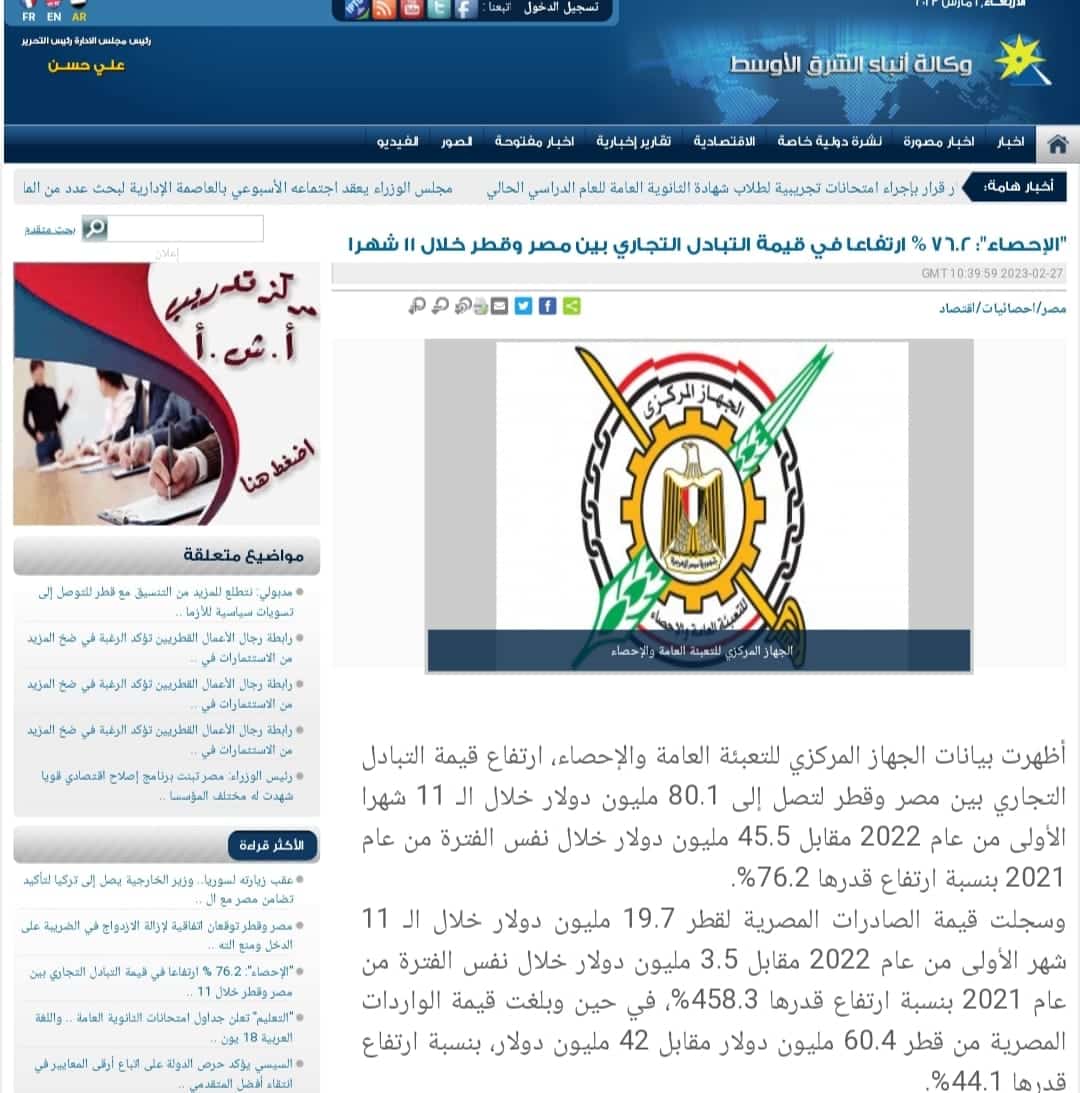 بيانات رسمية قطرية: التبادل التجاري بين مصر وقطر بلغ 96.15 مليون دولار عام 2022