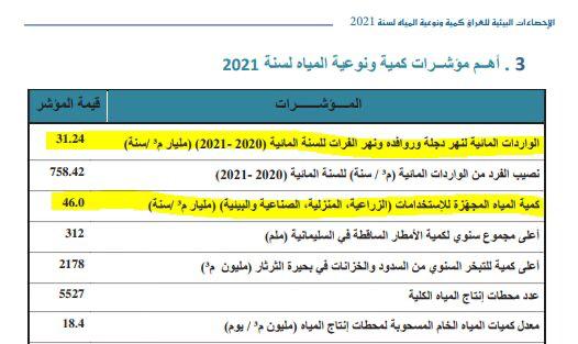 وفي عام 2021، بلغت الواردات المائية 31.2 مليار مترًا مكعبًا فقط، حيث تظهر الإحصاءات انخفاض الإيراد المائي لهذا العام بنسبة 38%، وفقدان نحو 18.5 مليار مترًا مكعبًا من الإيرادات المائية، فيما كانت كمية المياه المجهزة للاستخدامات الكلية المختلفة، 46 مليار مترًا مكعبًا، انخفاضًا بنحو 3 مليارات متر مكعب مقارنةً بعام 2020، فضلًا عن انخفاض حصة الفرد من الماء إلى 758 مترًا مكعبًا خلال العام، مقارنة بأكثر من 1.2 ألف متر مكعب في 2020، ونحو 2.4 ألف متر مكعب في 2019.