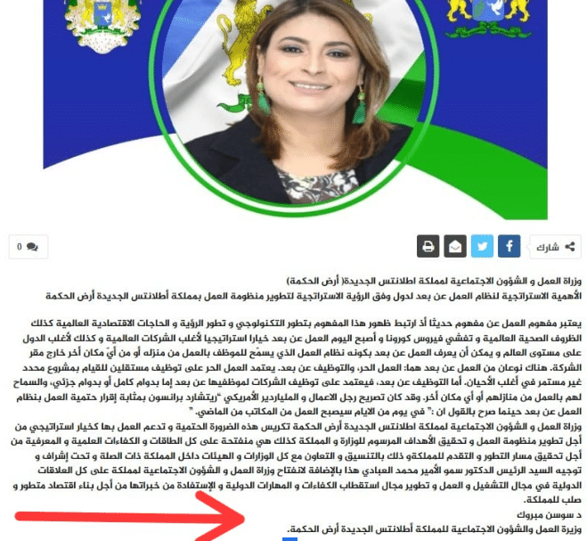 قام فريق تفنيد بالرجوع إلى الموقع الخاص للملكة وبالفعل لم يكن اسمها موجودا ضمن قائمة وزراء حكومة أطلانتس، إلا أنه وجدنا عددا من المقالات التي كتبت باسمها وبصفة رسمية "وزيرة العمل والشؤون الاجتماعية للمملكة أطلانتس الجديدة أرض الحكمة".