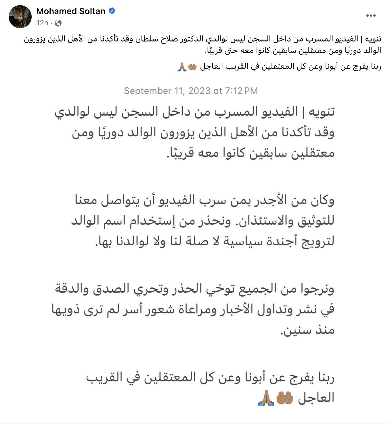 الحقوقي المصري محمد سلطان ينفي ظهور والده في الفيديو المسرب من سجن بدر