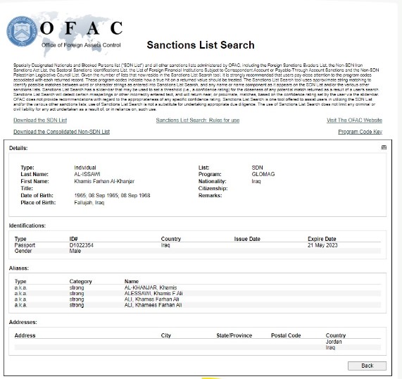 وبالتتبع اكتشف فريق "تفنيد" أن الصورة المنتشرة هي مجرد عملية بحث في قائمة SDN لمكتب مراقبة الأصول الأجنبية التابع لوزارة الخزانة الأمريكية، والتي تدرج شخصيات ومؤسسات وكيانات على قائمة عقوباتها، وعند البحث عن اسم خميس الخنجر يظهر اسمه لأنه مدرج على قائمة العقوبات منذ عام 2019، ولا يوجد إجراء جديد في حقه.