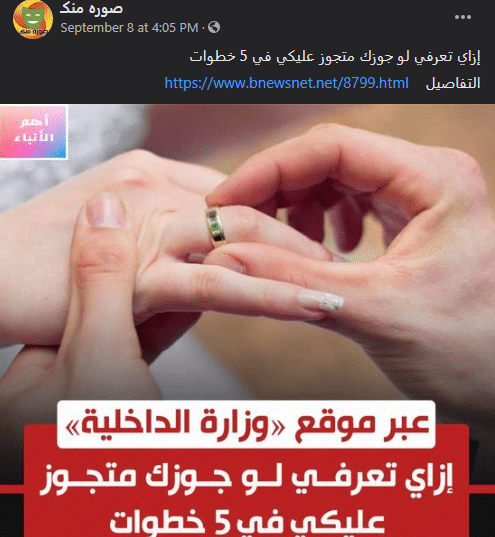 نفى مصدر أمنى في بيان يوم الأربعاء 8 سبتمبر 2021، عبر الحساب الرسمي لوزارة الداخلية المصرية، مانشره أحد المواقع الإخبارية بشأن وجود أية أمور تتعلق بالزواج أو الطلاق على موقع الوزارة. فند فريق عملنا نفي الوزارة ووجد أنه صحيح، وقد نشر موقع "أخبارك نت" خبرًا تحت عنوان ”إزاي تعرفي لو جوزك اتجوز عليكي“. نسب الموقع إلى الصفحة الرسمية للوزارة معلومات تفيد بإمكانية استعلام المواطن أو المواطنة عن البيانات الشخصية التي تتعلق بحالات الزواج أو الطلاق المسجلة بقاعدة بيانات قطاع الأحوال المدنية بوزارة الداخلية عبر الصفحة الرسمية للوزارة. وتداول هذا الخبر العديد من الحسابات عبر موقع ”فيسبوك“، قبل أن يقوم موقع ”أخبارك نت“ بحذفه.