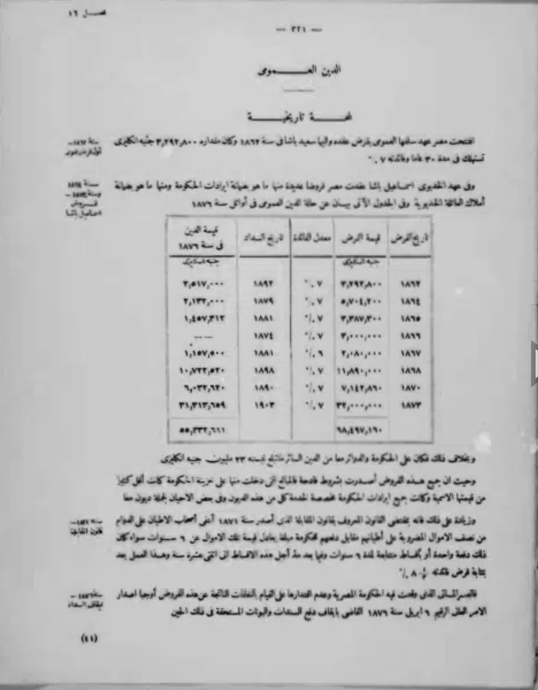 وبالبحث في جدول الديون الموجود في الكتاب الإحصائي السنوي الصادر من الجهاز المركزي للتعبئة العامة والإحصاء عام 1910، اتضح أن القروض ارتفعت بعد عام واحد من تولي الخديوي إسماعيل إلى 5 ملايين و704 آلاف و200 جنيه إنجليزي عام 1864، حتى وصلت إلى 32 مليون جنيهًا إنجليزيًا عام 1873.