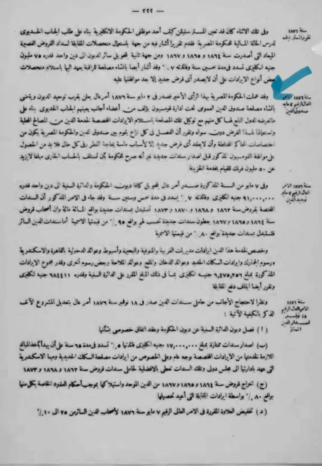 ووفقًا للوثيقة ذاتها السابق ذكرها تم إنشاء صندوق الدين بمصـر يوم 2 مايو 1876 وذلك بعد عجز الخديوي إسماعيل عن سداد أقساط ديون مـصر المستحقة للبنوك الأوروبية، ويتكون من 4 أعضاء، إنجليزي وفرنسي ونمساوي وإيطالي، وتم إلغاء الصندوق باتفاقية ثنائية بين الحكومتين البريطانية والمـصرية، وقعت في 17 يوليو 1940، وفقًا لوثيقة منشورة على موقع وزارة الخارجية البريطانية.
