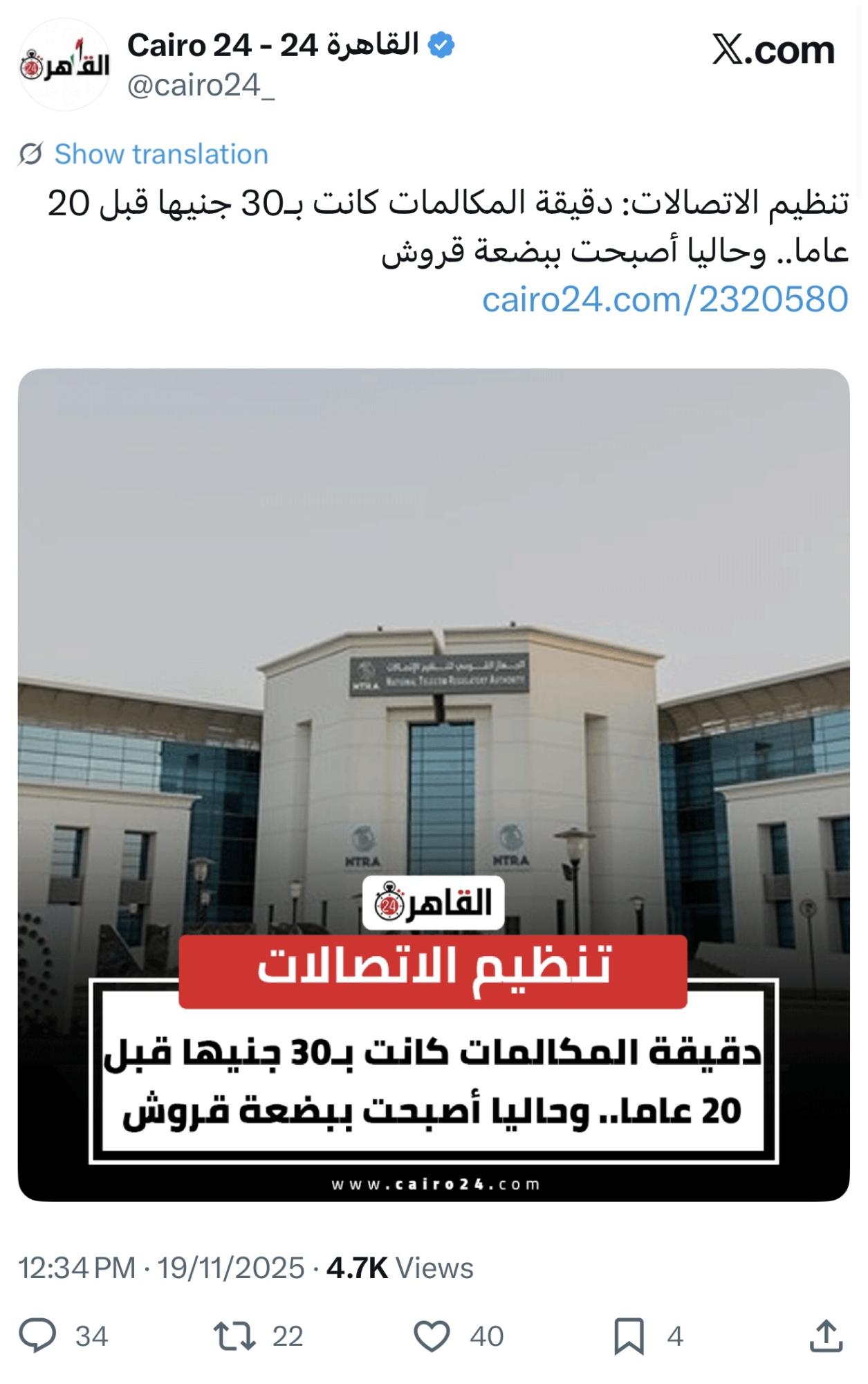 تتبع فريق "تفنيد" تصريحات رئيس قطاع أول التفاعل المجتمعي بالجهاز القومي لتنظيم الاتصالات، والتي أطلقها خلال حوار خاص لموقع "القاهرة 24"، بتاريخ 19 نوفمبر 2025، بشأن سعر دقيقة الاتصالات في بداية دخول شركات الاتصالات، واكتشف أنها "غير صحيحة"، وفقًا لبيانات شركة موبينيل؛ ومواقع إخبارية محلية؛ والجهاز القومي لتنظيم الاتصالات.