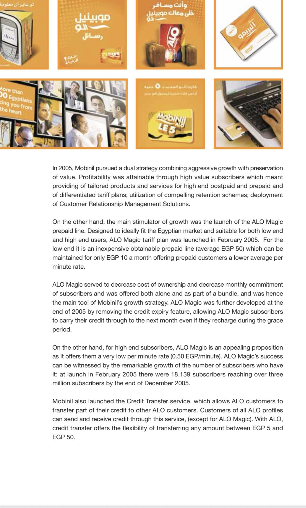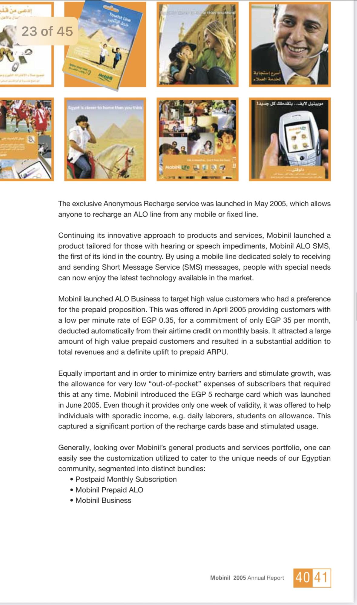 وأظهر التقرير السنوي لـMobinil عام 2005، وهو أقدم تقرير استطعنا الوصول إليه، أن سعر الدقيقة “per minute rate” هو 0.50 قرش لبعض العملاء، مع تمييز عملاء آخرين بسعر 0.35 قرش للدقيقة، وذلك خلال عرض خطط أسعار الشركة لجذب العملاء وزيادة عددهم.