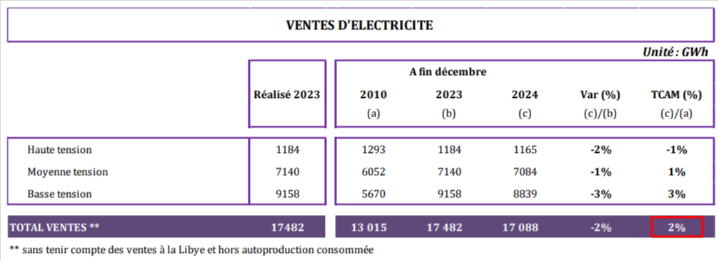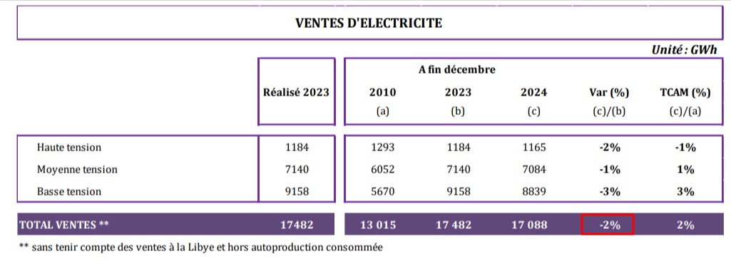 وقدّر متوسّط الارتفاع السنوي لاستهلاك الكهرباء طيلة الفترة بين 2010 و2024 بـ2%، حيثُ ارتفع من 13 ألفا و15 جيغاواط في الساعة إلى 17 ألفا و88 جيغاواط في الساعة، وذلك وفقا لما أوردتهُ وزارة الصناعة والطاقة والمناجم في نشرتها "Conjoncture énergétique à fin décembre 2024".