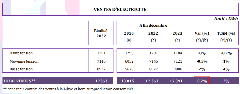 وجاء حجم مبيعات الكهرباء لسنة 2023 الذّي أوردته وزارة الصناعة في نشرتها لذات السنة مختلفا بشكل طفيف مع التحديث الذّي أوردتهُ في نشرة سنة 2024؛ وبالتالي فإنّه باحتساب نسبة تطوّر مبيعات الكهرباء بين سنتي 2022 و2023 استنادا للبيانات المحدثة، كانت في حدود 0.6%.