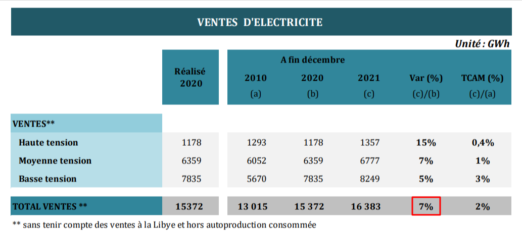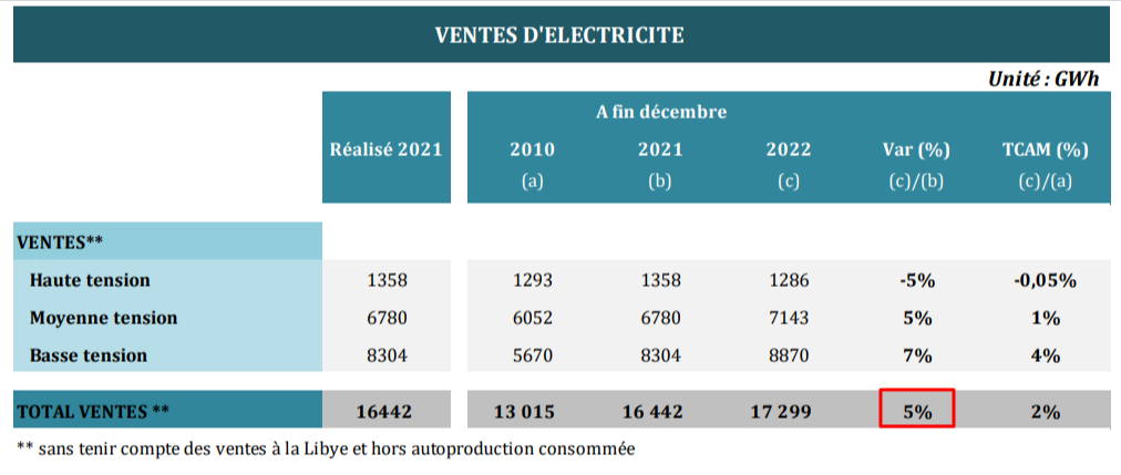 ووفقا للوزارة، شهدت مبيعات الكهرباء ارتفاعا لا يتجاوز 5% في سنة 2022، مقارنة بـ2021، من 16 ألفا و442 جيغاواط في الساعة إلى 17 ألفا و299 جيغاواط في الساعة، وهو معطى مؤقّت رفّعته إلى 17 ألفا و363 جيغاواط في الساعة في نشرتها لسنة 2023.