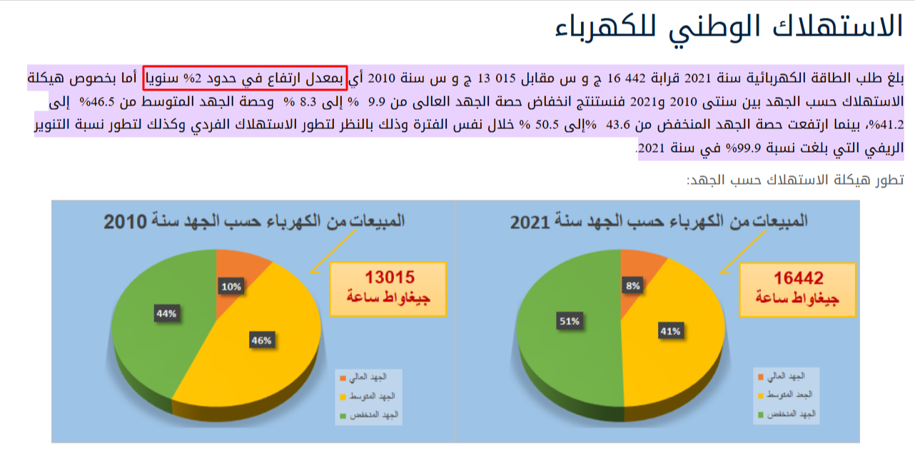 ويتوافقُ هذا المعطى مع بيانات أوردتها الوزارة في نبذة عن الاستهلاك الوطني للكهرباء نُشرت على موقعها الإلكتروني الرسمي، وتُفيد بأنّ الطلب على استهلاك الطاقة الكهربائية سجّل معدّل ارتفاع في حدود 2% سنويّا طيلة الفترة بين 2010 و2021.