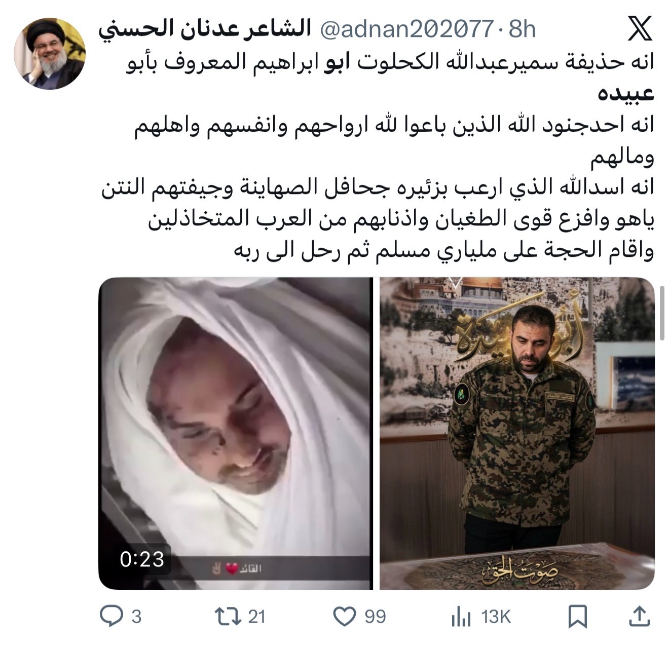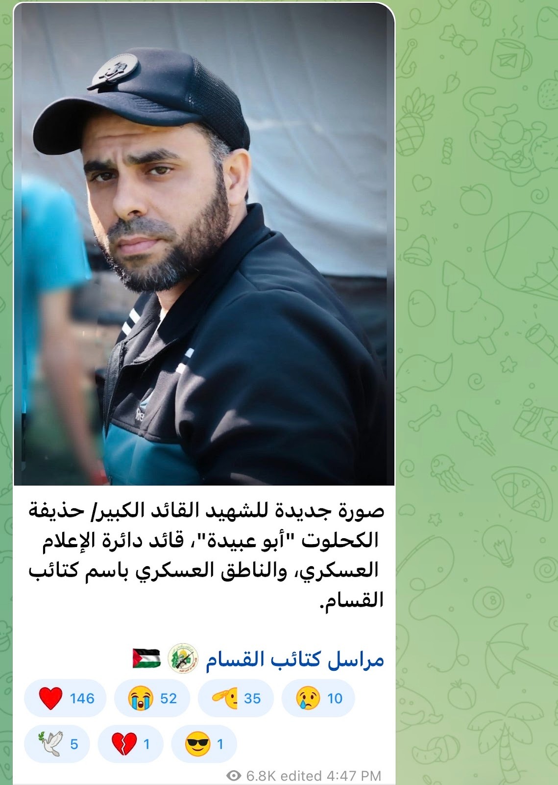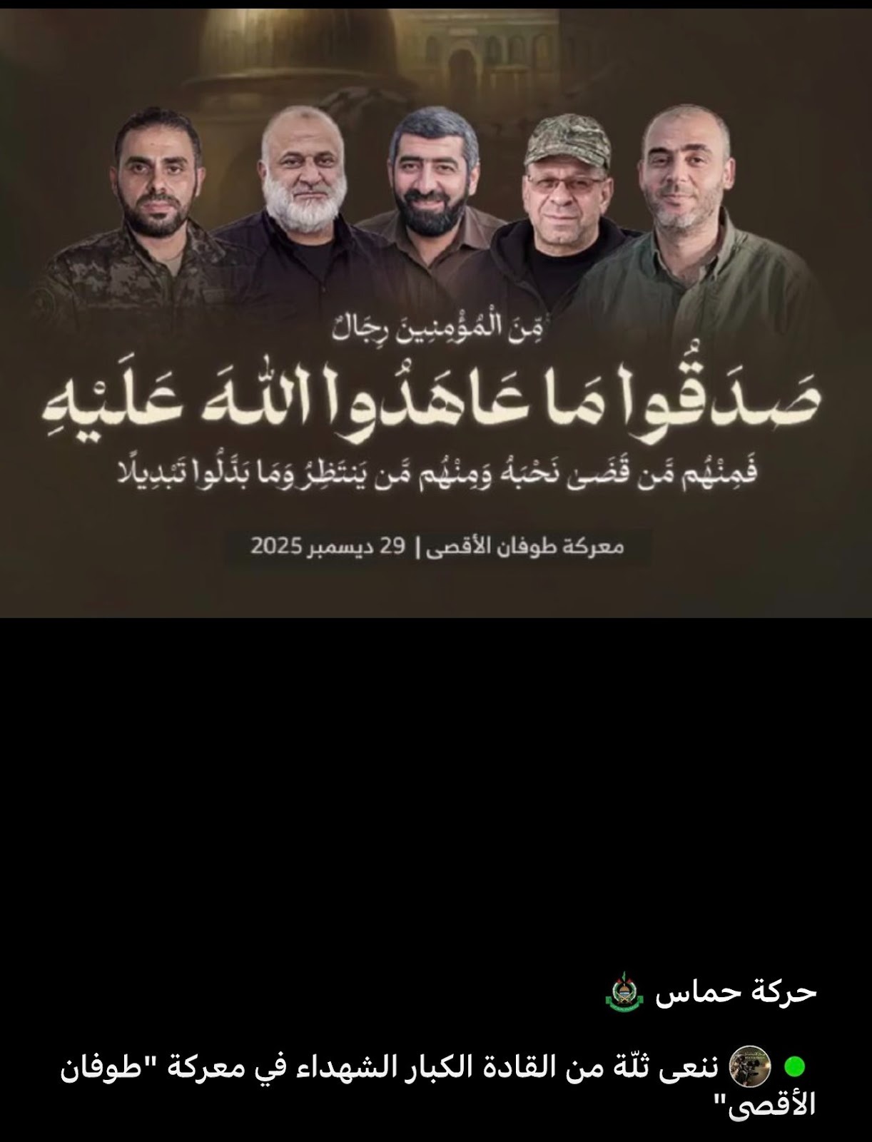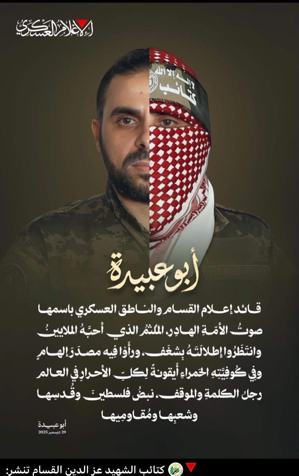 وكانت قد أكدت حماس أمس الاثنين 29 ديسمبر 2025، استشهاد المتحدث باسم كتائب القسام "أبو عبيدة" بعد أشهر من إعلان إسرائيل أنه قتل في غارة جوية في غزة.