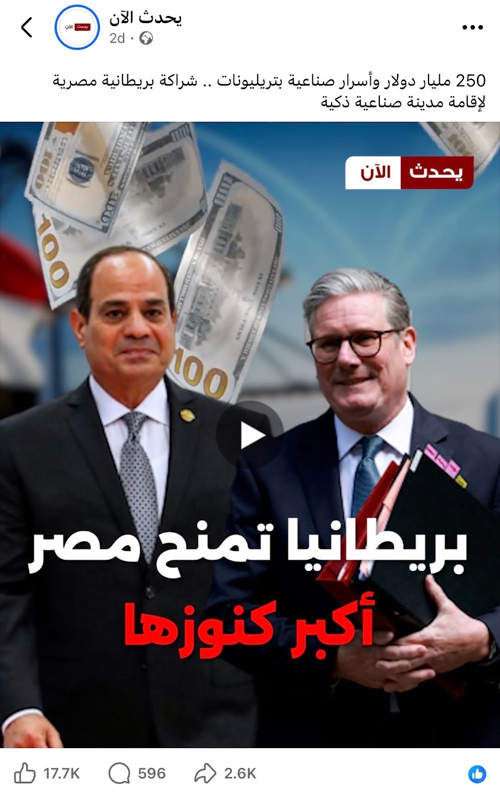 تتبع فريق "تفنيد" الادعاء المتداول على موقعي التواصل الاجتماعي فيسبوك وإكس، منذ 5 إلى 8 يناير 2026، بشأن صفقة شراكة جديدة بين بريطانيا ومصر تزيد من استثمارات الأولى في مصر من 50 مليار دولار إلى 250 مليار دولارًا لبناء مدينة صناعية ذكية، واتضح أنه "غير صحيح" وفقًا لموقع رئاسة الوزراء المصري.